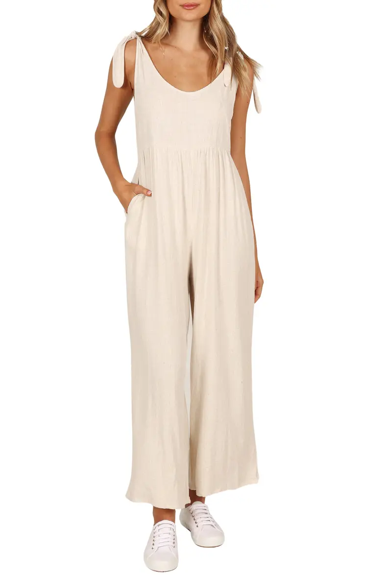 Elevate your contemporary wardrobe with this tie-shoulder linen jumpsuit finished with wide legs and handy side pockets.