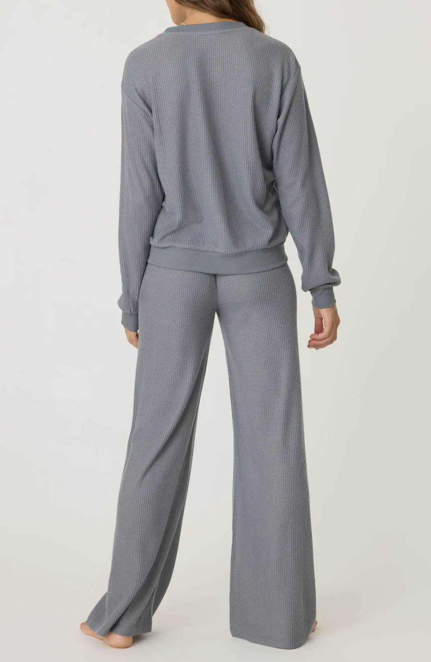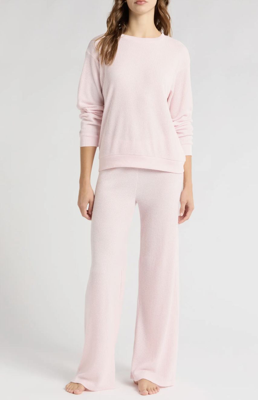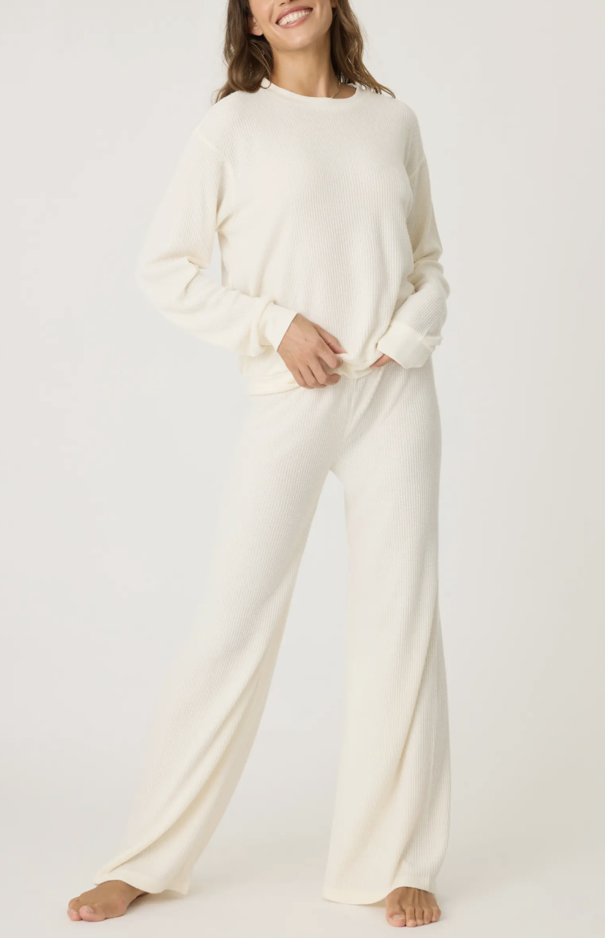 Rule the cozy club in these supersoft thermal pajamas that pair a roomy long-sleeve top with matching wide-leg pants.
