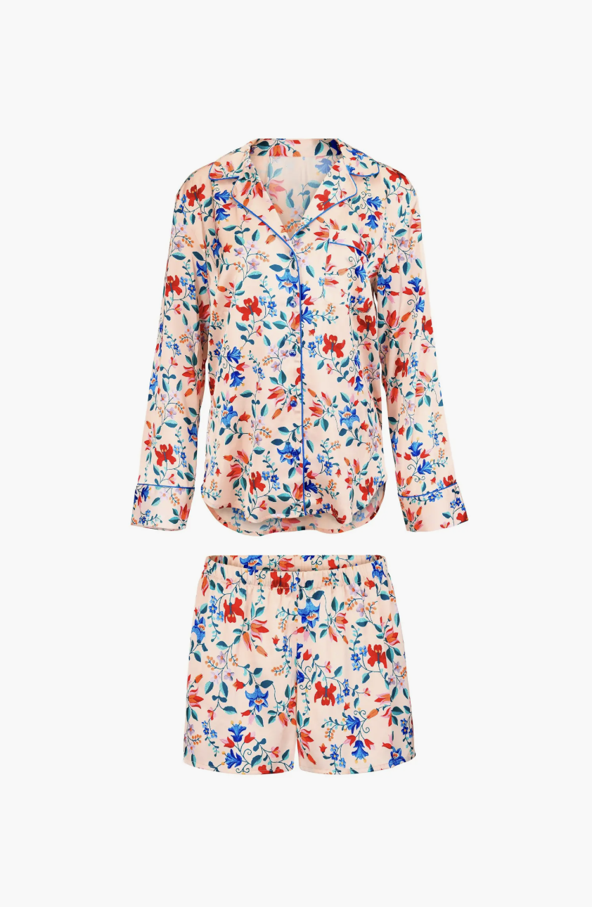 Details & care Curl up in this PJ Set! This satin set features a long sleeve button-down top with contrast piping and a matching short with an elasticated waistband. PJ Set Easy fit long sleeve button down top Notched collar Chest pocket Contrast piping & buttons Matching easy fit short with elasticated waistband Item #10368025